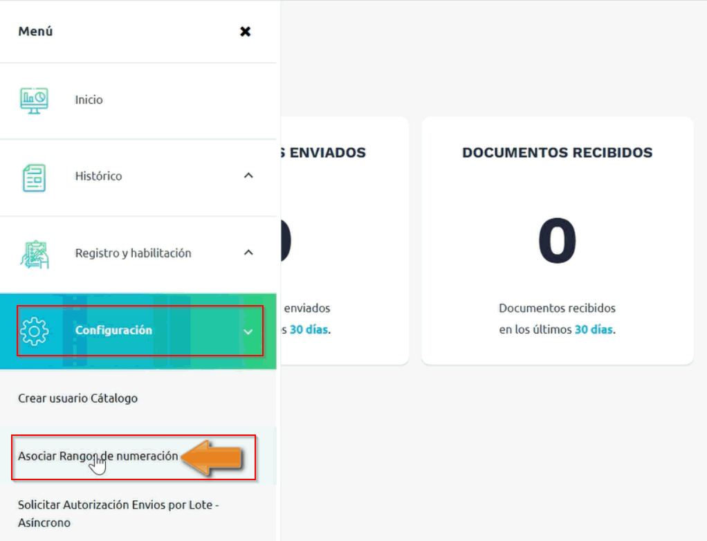 3. Luego, te direccionará a la plataforma de la DIAN, allí accedes al menú principal y selecciona Configuración – Asociar Rangos de numeración.