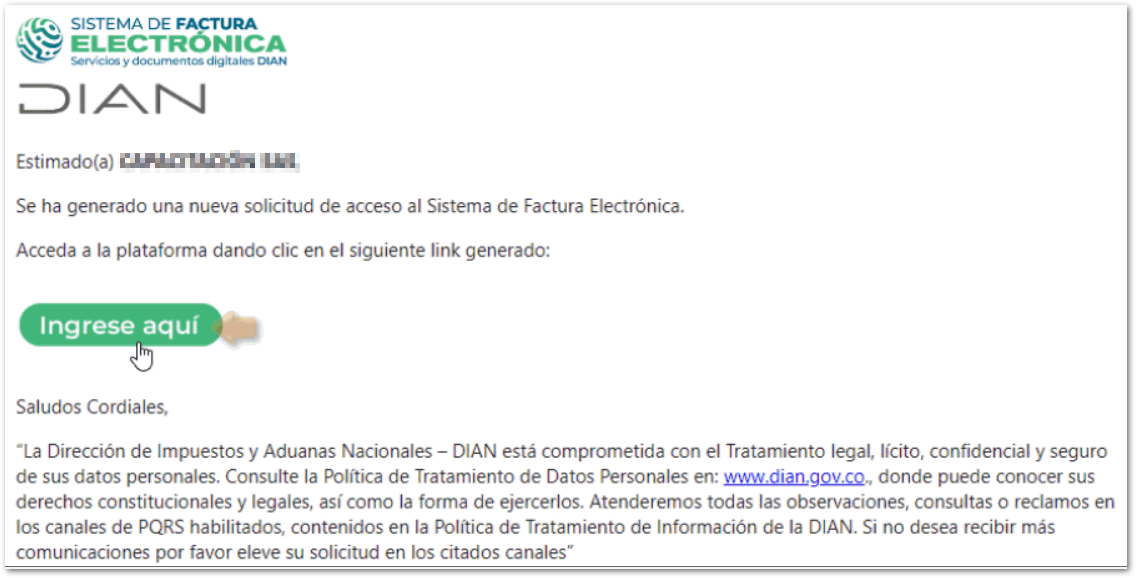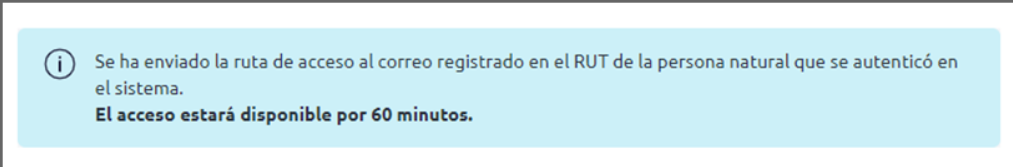 Visualizarás la siguiente pantalla, donde te informa que la ruta de acceso llegará al correo electrónico registrado en el Registro Único Tributario (RUT).