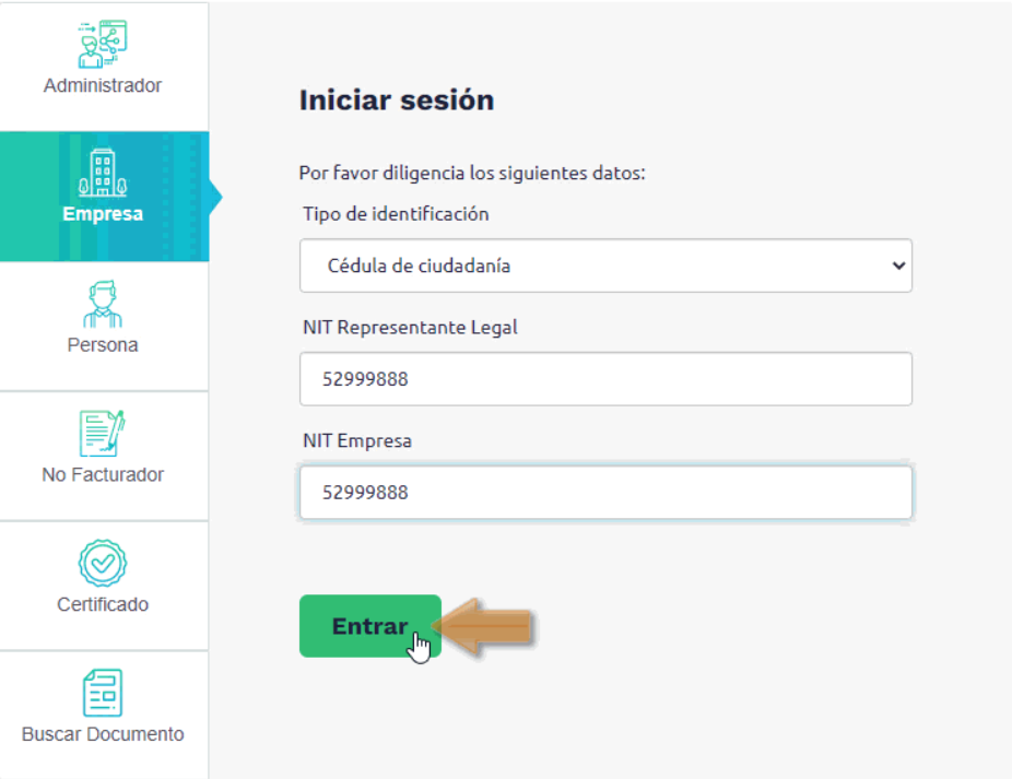 2. Luego eliges el tipo de usuario con el cual te registraste ante la DIAN (empresa o persona), digitas los datos solicitados por el sistema y das clic en el botón Entrar .