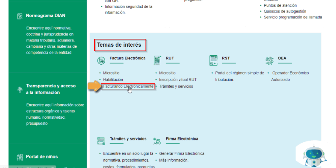 - Ingresa a la página de la DIAN www.dian.gov.co y allí en la sección Temas de interés, selecciona la opción Factura electrónica – Facturando electrónicamente.