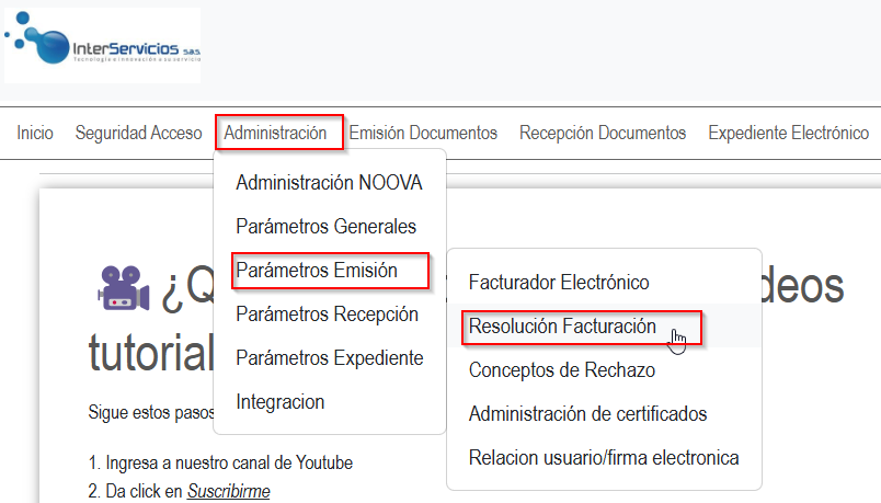 Una vez dentro de la plataforma, diríjase a Administración > Parámetros de Emisión > Resolución de Facturación.