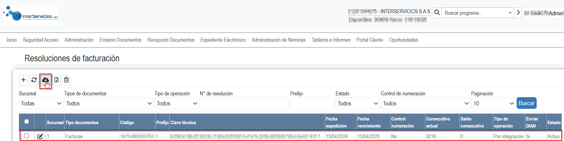 Haga clic en el botón "Obtener Consecutivos DIAN" para sincronizar la resolución con la plataforma. Este paso es fundamental para que la DIAN reconozca los rangos de numeración asociados a su empresa.