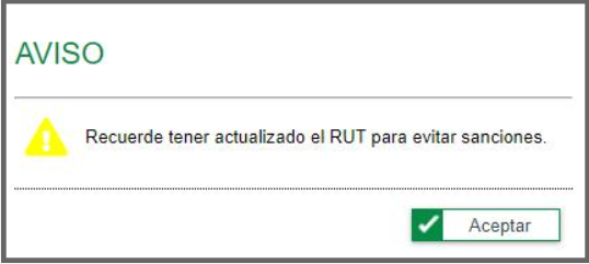 3. Allí, el sistema te mostrará la siguiente ventana, donde te hace la aclaración de que es necesario tener el RUT actualizado para evitar sanciones.