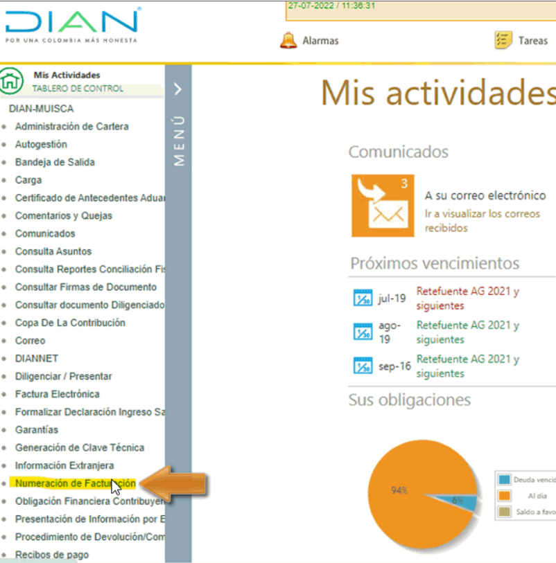 Una vez accedas a la plataforma, seleccionas la opción “Numeración de facturación”.