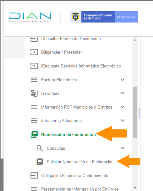 2. Se te habilitará un menú en la parte lateral izquierda, donde seleccionas la opción Numeración de Facturación y Solicitar Numeración de Facturación.