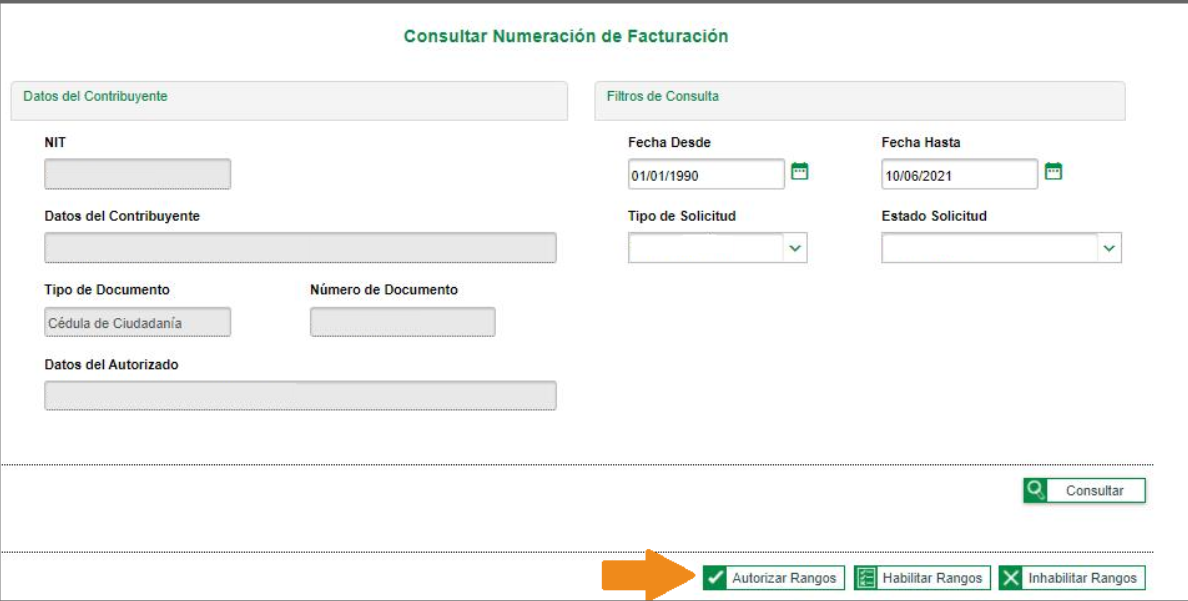 5. En la consulta de la numeración de facturación, das clic en “Autorizar Rangos”: