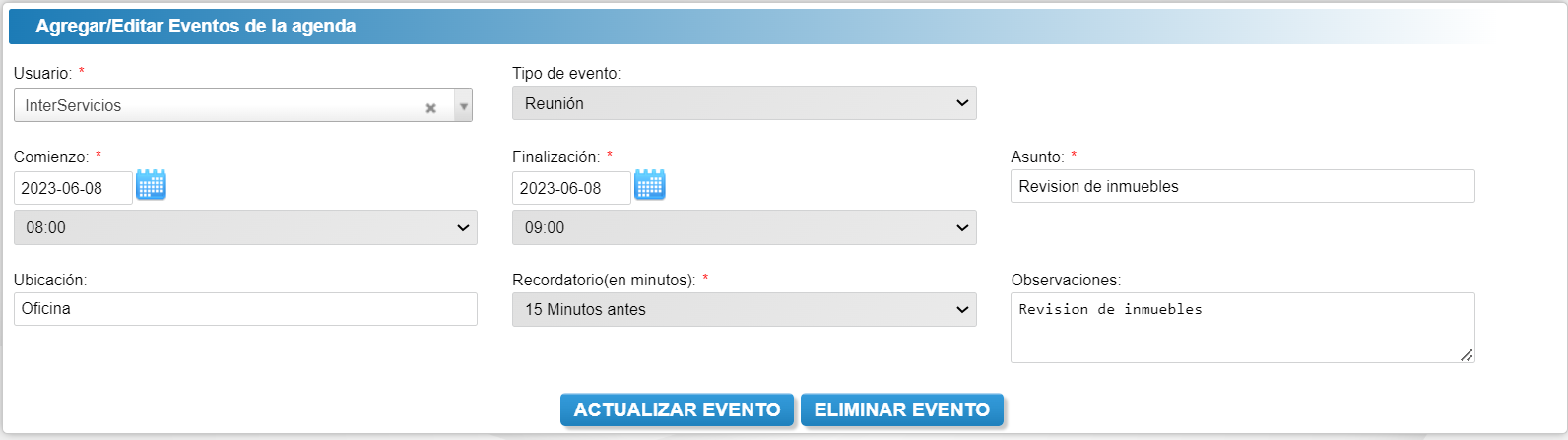 Automáticamente el evento quedará guardado en la agenda, el sistema le enviará un recordatorio al correo según el tiempo que usted seleccione en recordatorio.