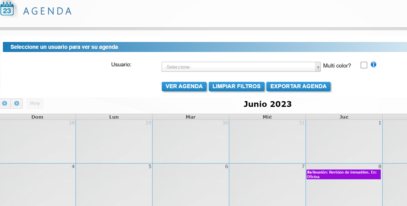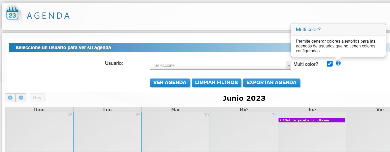 Paso 2: Se visualizará un calendario donde se podrá filtrar por empleado y consultar los eventos programados para cada uno de ellos, también se tendrá la opción de exportar agenda y habilitar variedad de colores para los usuarios.