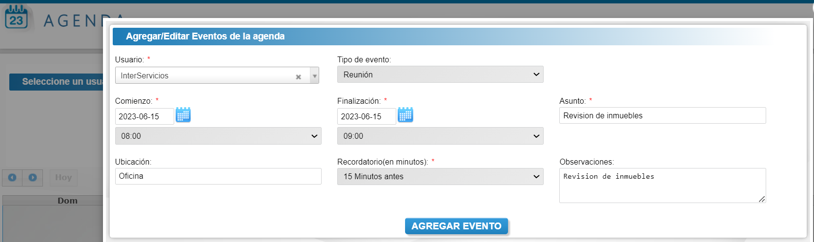 Ingrese usuario, tipo de evento, comienzo, finalización, asunto, ubicación, recordatorio (en minutos), observaciones y de clic en el botón agregar evento.