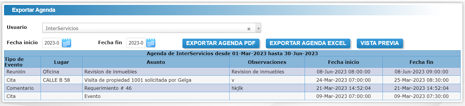 Ingrese al módulo Agenda y de clic sobre el botón Exportar agenda, el cuál le permitirá descargar en PDF, Excel o ver en vista previa la agenda de un usuario y tiempo determinado.