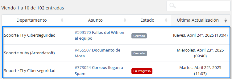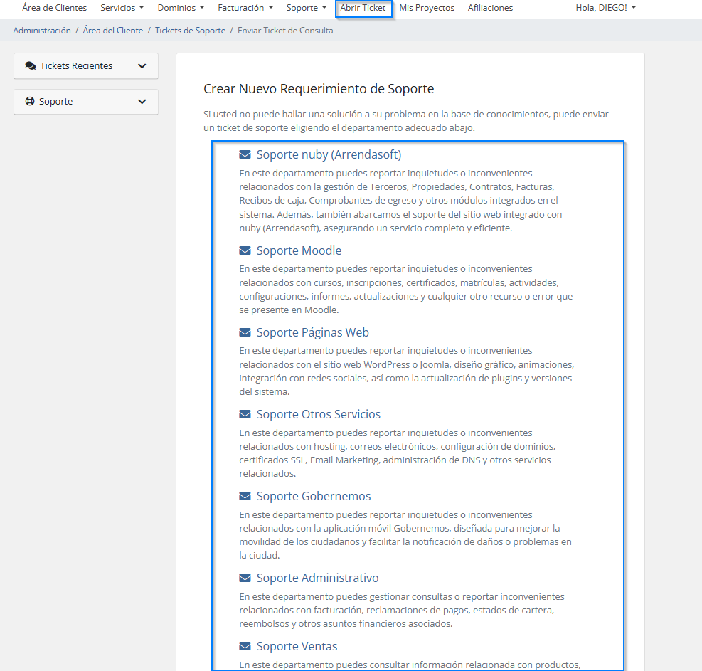 - Departamento (Ej: Soporte nuby - Arrendasoft).