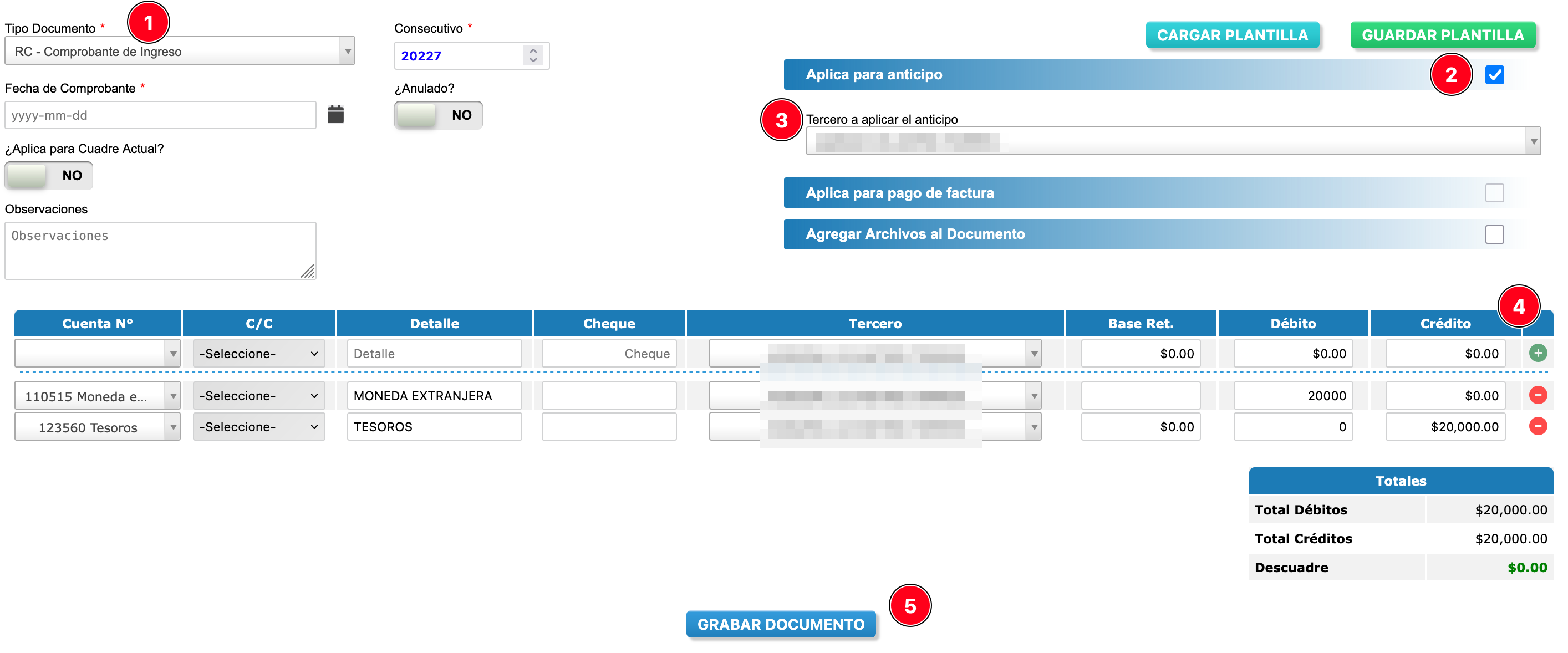 - Tercero a aplicar el anticipo: Cuando marcamos que aplica para anticipo, se muestra una lista para seleccionar el tercero al cual aplicará.