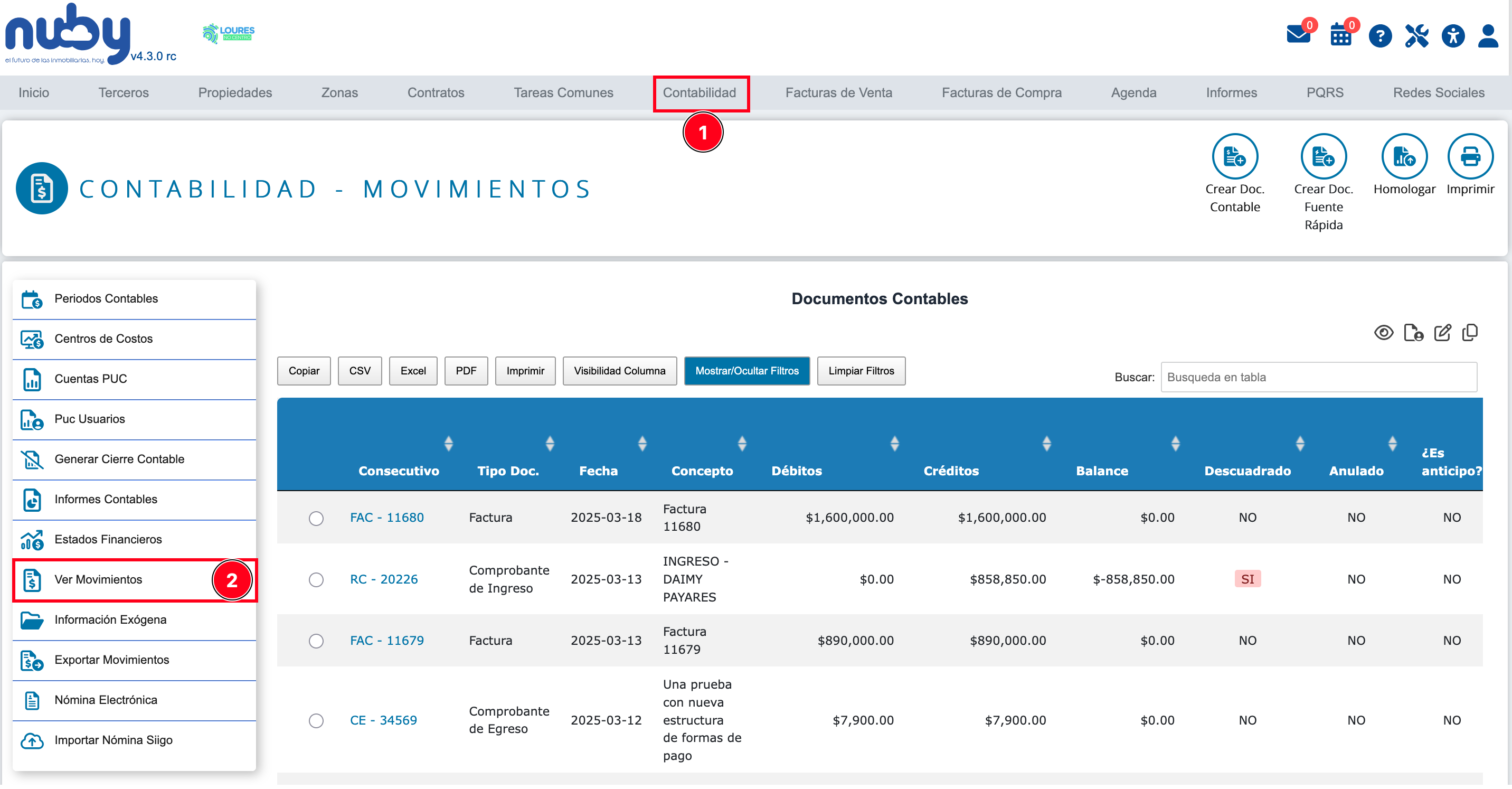 Paso 1: Busque la opción "Contabilidad" del menú horizontal situada en la parte superior y haga clic en ella, luego haga clic en la opción "Ver Movimientos" del submenú al costado izquierdo del módulo de contabilidad.