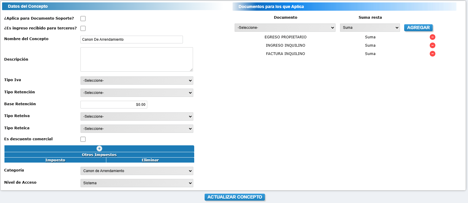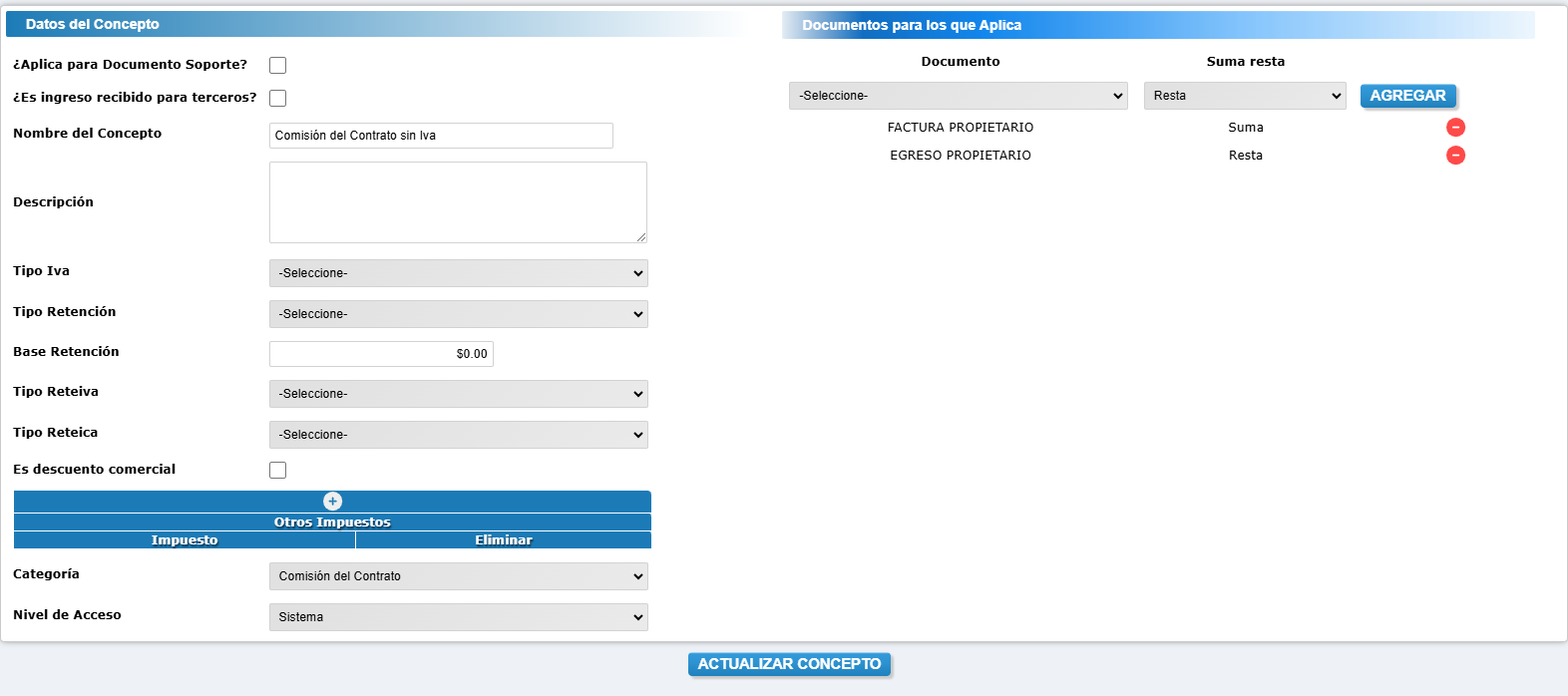 - Documentos para los que Aplica: Relaciona el concepto con documentos como "Factura Propietario" (suma) y "Egreso Propietario" (resta).