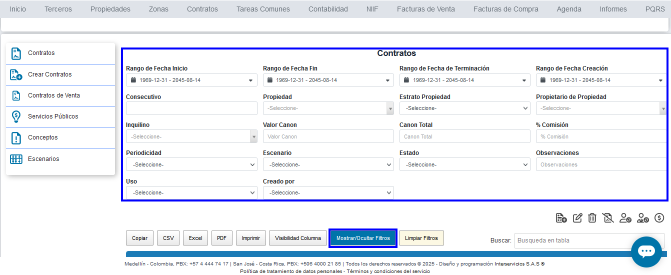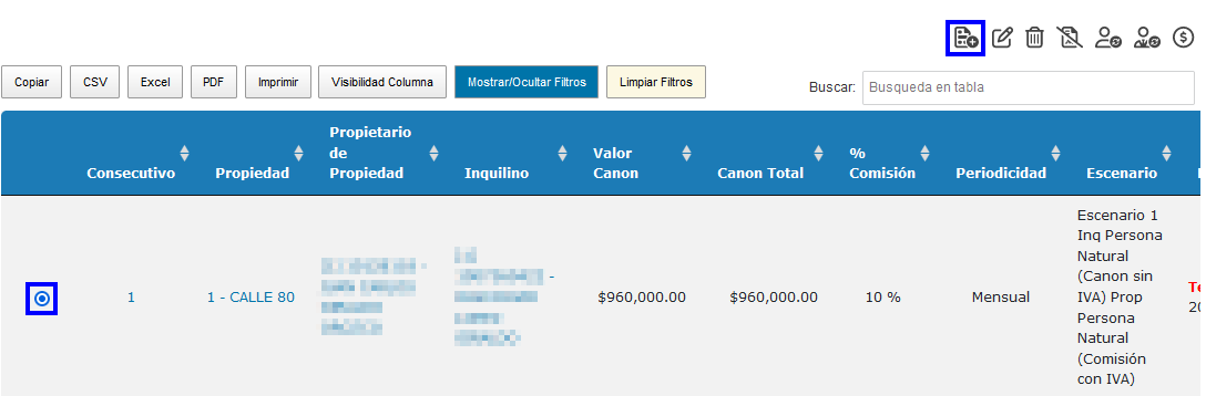 Localice el contrato deseado utilizando la sección de filtros y marque la casilla circular ubicada a la izquierda de cada registro en la tabla.