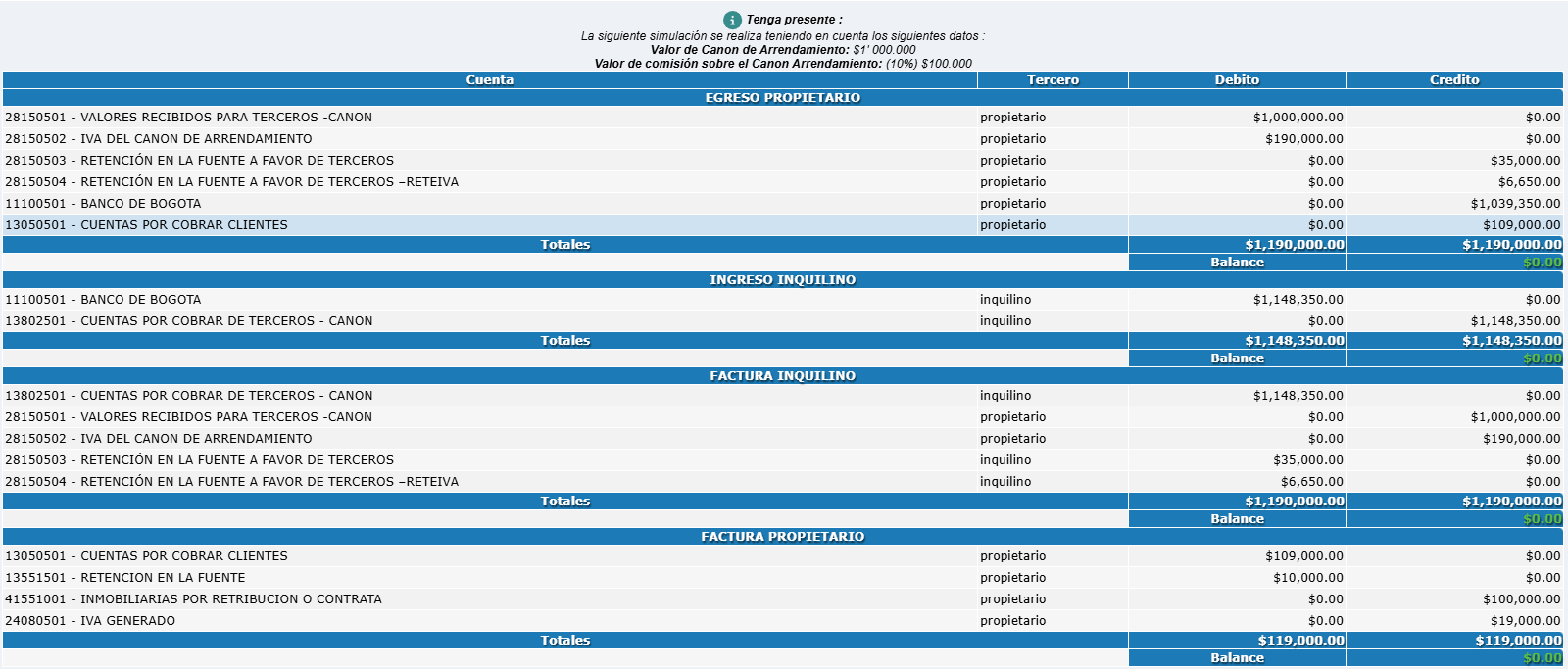 - 28150501 - Valores recibidos para terceros (Canon): Registra el canon base recibido del inquilino ($1,000,000).