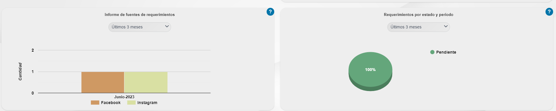 - Requerimientos pendientes de atención: Se mostrará un indicador con los requerimientos pendientes y al dar clic lo direccionará a otra ventana con la lista de requerimientos y sus detalles.