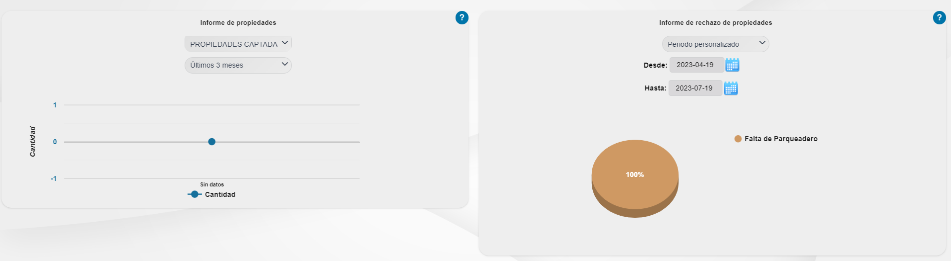 - Informe de Propiedades Captadas: El total de propiedades captadas en los meses dentro de un rango de fechas. Rango de fechas de máximo 6 meses. Por defecto: últimos 6 meses hasta la fecha actual.