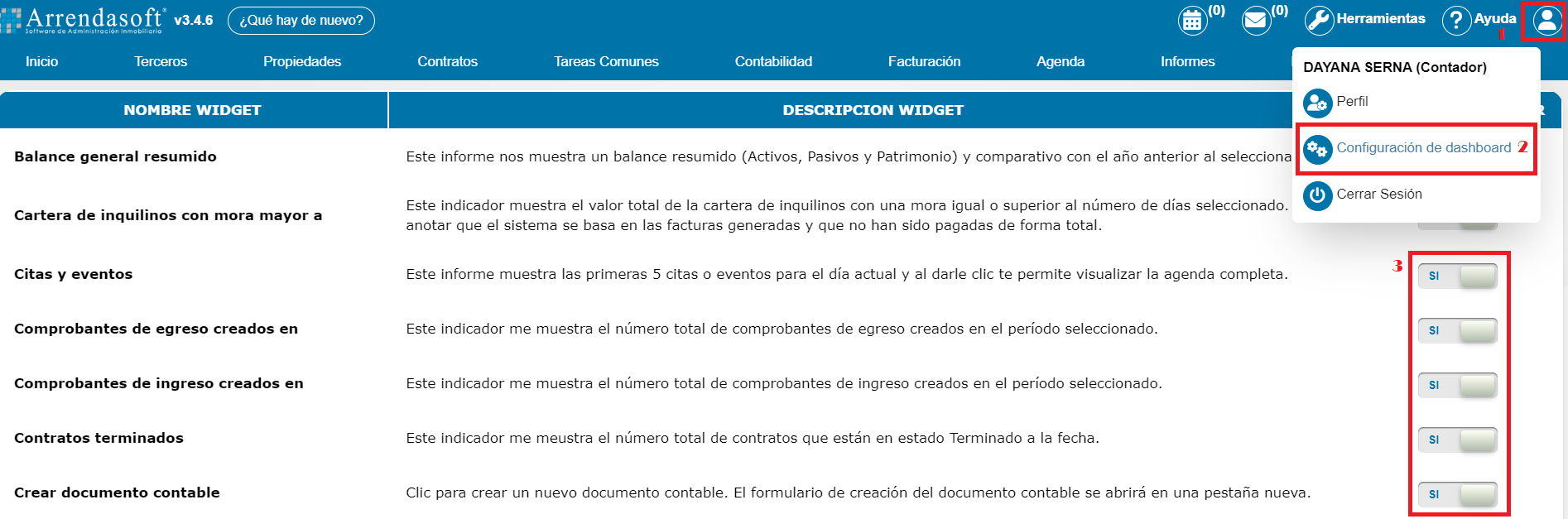 Nota: Recuerde que puede personalizar su dashboard, al habilitar o deshabilitar la información que desea visualizar y ocultar. Para ello debe dar clic en Perfil > Configuración de dashboard y se mostrará un listado de todos los indicadores. Marque SI el que desea ver y No para el que desea ocultar. (Como se muestra en imagen adjunta).