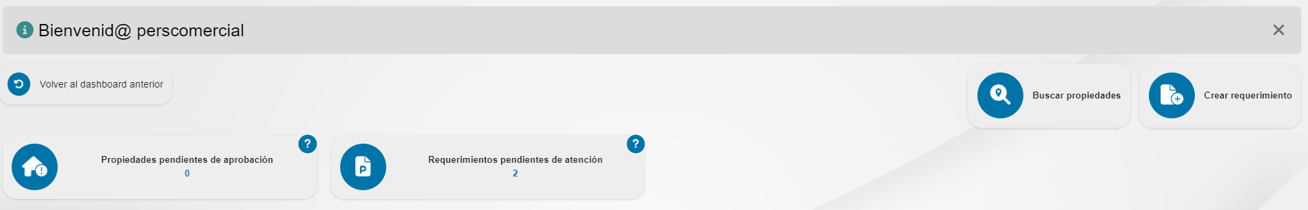 - Propiedades pendientes de aprobación: Se mostrará un indicador con las propiedades pendientes de aprobación donde al dar clic lo direccionará a otra ventana con la lista de las propiedades pendientes.