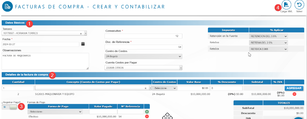 Paso 2: Da clic en el botón "Crear factura de compra", el sistema desplegará un formulario para registrar la factura de compra o cargarla desde un archivo XML. Este formulario consta de los siguientes bloques: