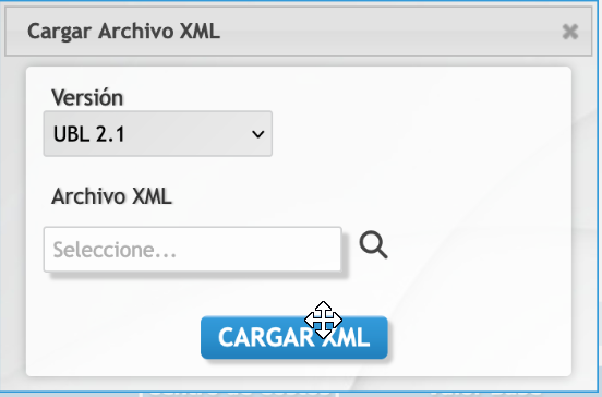 Cargar XML: Utiliza esta opción para pre-diligenciar la información desde un archivo XML. Este archivo debe ser el recibido por correo electrónico con los detalles de la factura electrónica emitida. Al hacer clic en este botón, se abrirá un formulario para seleccionar la versión del archivo a cargar y cargar el archivo XML.