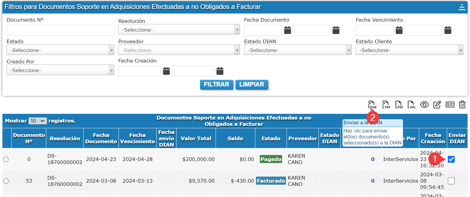 Paso 2: Selecciona el Documento soporte desde la casilla circular lado izquierdo y da clic en ‘Enviar a la DIAN’ y cambiará el estado del documento a ‘Exitosa’. En caso de quedar ‘fallida’ o no se envíe, debes corregir el error y enviar nuevamente el documento.