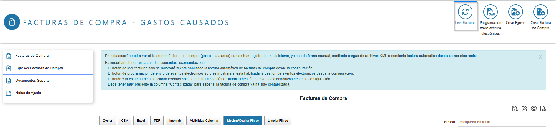 Paso 1: Ingrese a "Facturas de compra" y en el submenú de la izquierda, seleccione "Facturas de compra". A continuación, haz clic en el botón "Leer facturas".