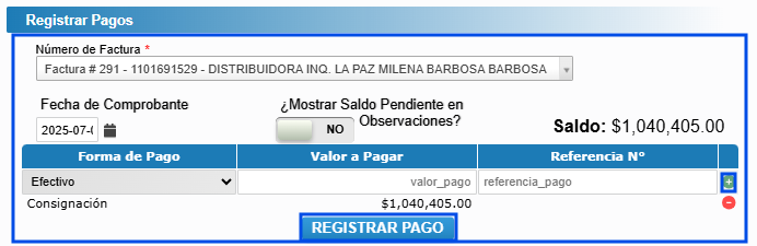 Número de Factura | Seleccione la factura a pagar | ✅ Sí | La factura debe estar en estado facturado. |
