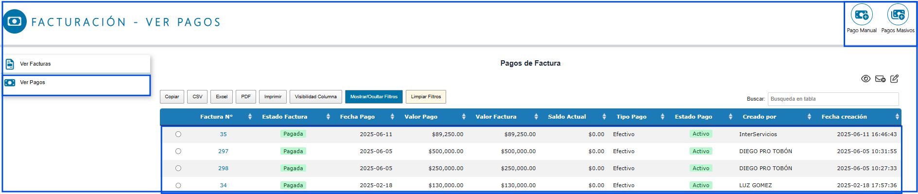 Botón para "Pago Manual/Pagos Masivos" (para crear pagos nuevos).