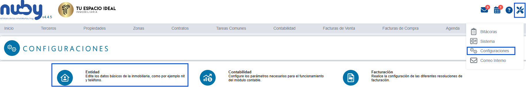 Herramientas → Configuraciones → Entidad.