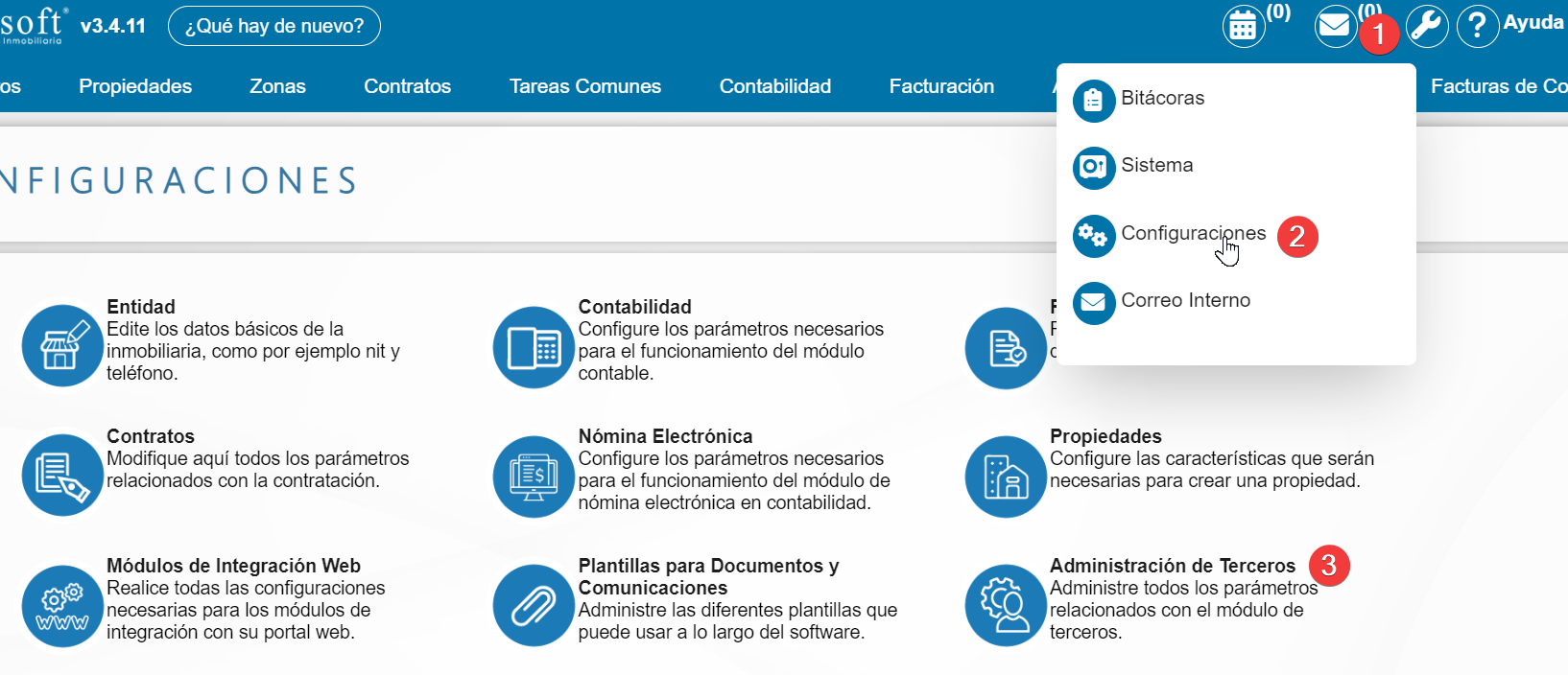 Paso 1: Acceda a la información dando clic en Herramientas y luego en la opción Configuraciones y Seleccione la opción administración de terceros.