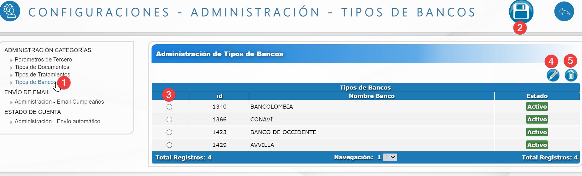 - Desde la casilla circular podrá seleccionar el registro para editar o borrar el banco.