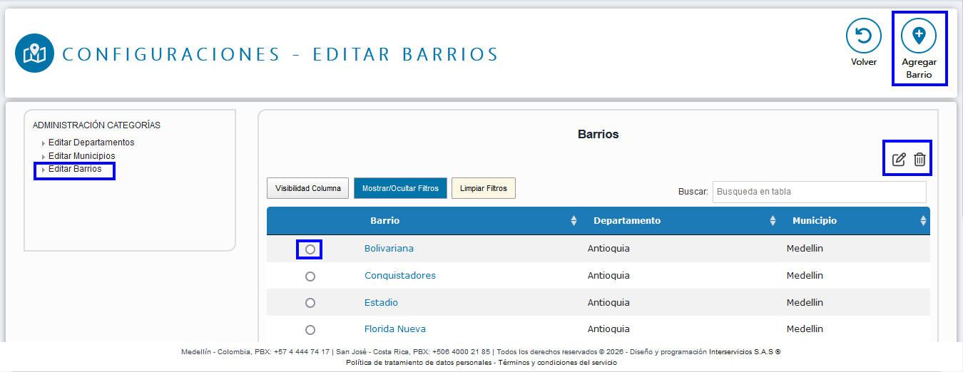 Con esta opción podrá crear y administrar la información de los departamentos, municipios y barrios.