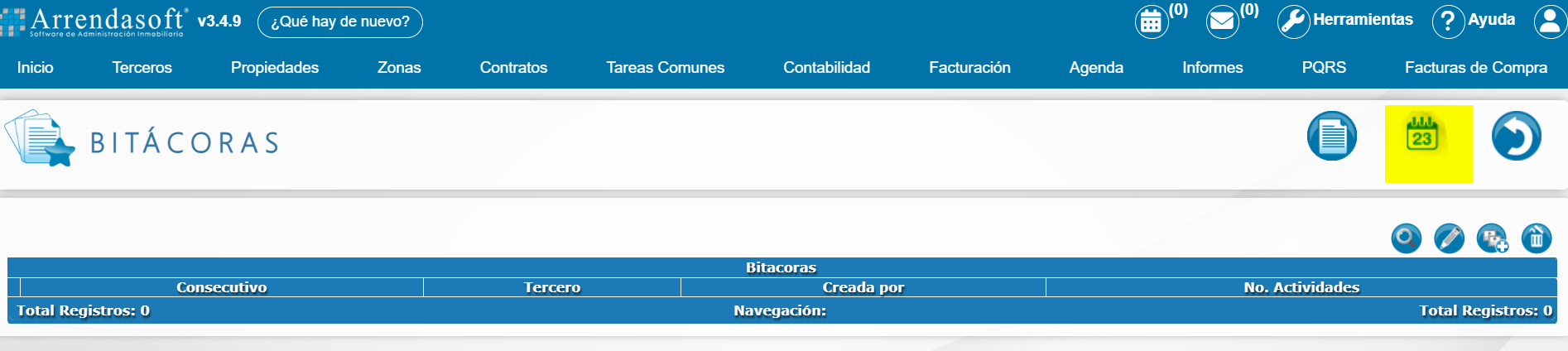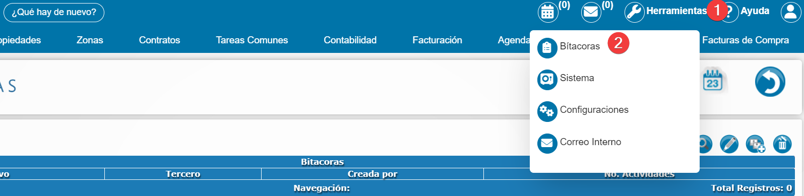 - Debe ubicar la opción Herramientas arriba del menú horizontal situada en la esquina superior derecha, luego dar clic en el menú desplegable la opción bitácoras.