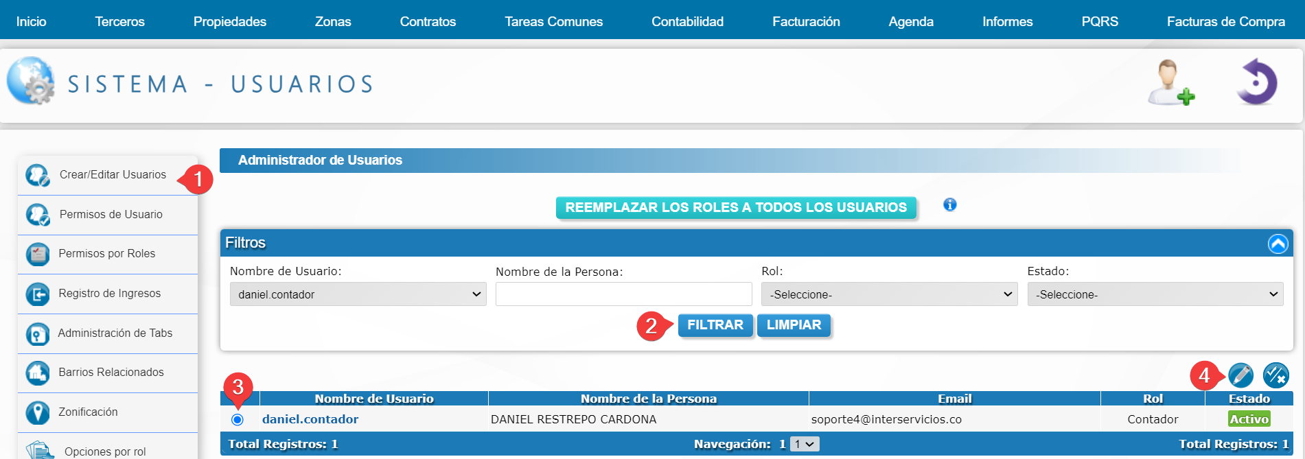 Paso 2: Utiliza las acciones que el sistema habilita después de realizar la búsqueda del usuario. Para ello, selecciona el usuario desde la casilla circular que está en el lado izquierdo de cada registro de la tabla.