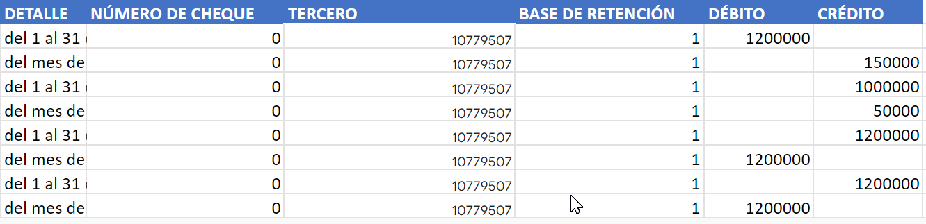 El campo tercero debe estar diligenciado con solo números sin puntos y sin comas, además indicar las cuentas que aplican a cada concepto.