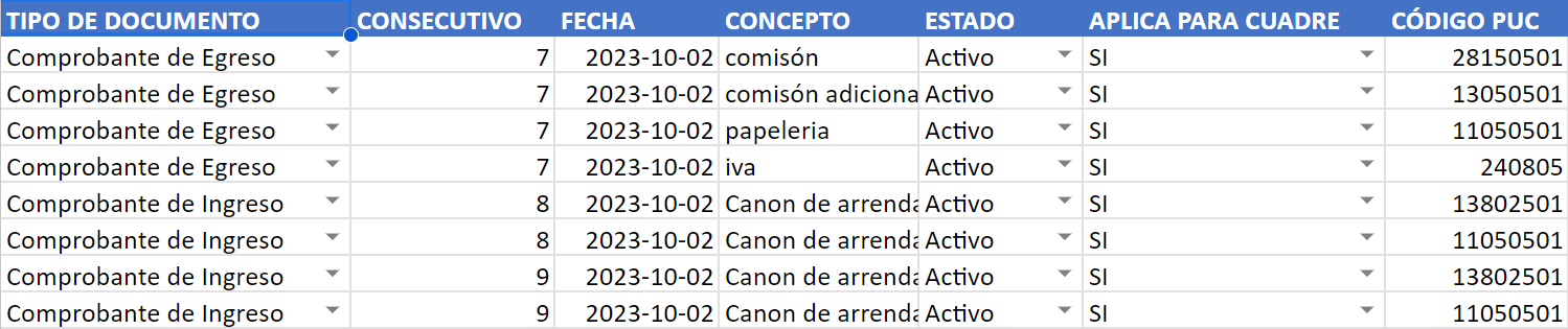 A continuación, se muestra en la imagen cómo completar la plantilla. Se debe diligenciar con la información contable de cada uno de los documentos que se van a importar al sistema. Los campos para ingresar consecutivo y código PUC deben ser completados únicamente con números, sin comas ni puntos.