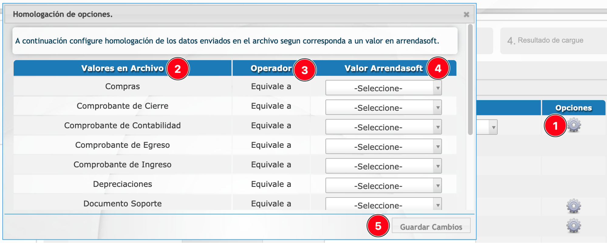 - Opciones: para los campos de Arrendasoft que son cerrados, es decir, una lista de selección que no permite escribir el valor, es necesario dar clic en el ícono del engranaje que nos abre un cuadro para hacer un mapeo de cada una de las variables.