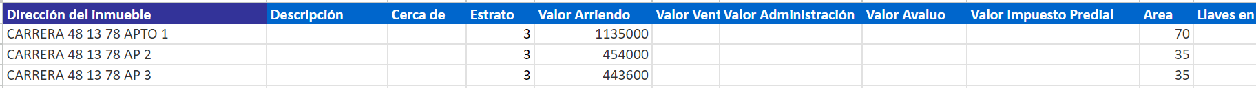Las propiedades no deben tener direcciones iguales, deben estar especificadas por apartamentos y torres.