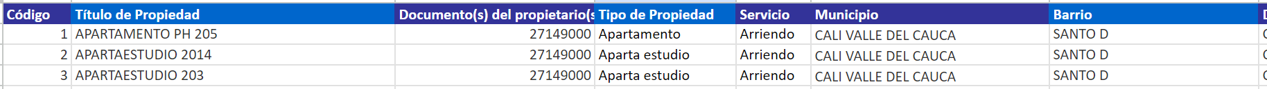 Nota: Si la propiedad tiene varios propietarios al momento de diligenciar la plantilla de Propiedades en el campo de Documento(s) del Propietario(s) se deben ingresar los documentos así: 1014309876,1014398809, 1014380054 (primer documento, separado por una coma (,) segundo documento, y así sucesivamente).