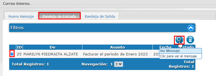 Paso 2: Luego aparecerá una ventana emergente, donde podrá revisar los correos recibidos. Para revisar el correo, por favor ingresar a las pestañas ubicadas en la parte superior Bandeja de entrada y Bandeja de salida seleccione el correo y de clic en el icono ver mensaje para visualizarlo.