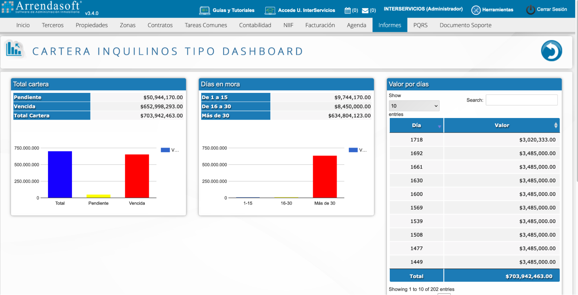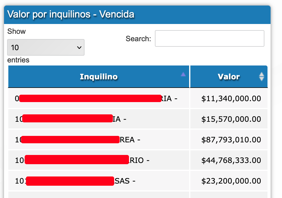 Valor por inquilinos - vencida: muestra la cartera vencida agrupando por inquilinos.
