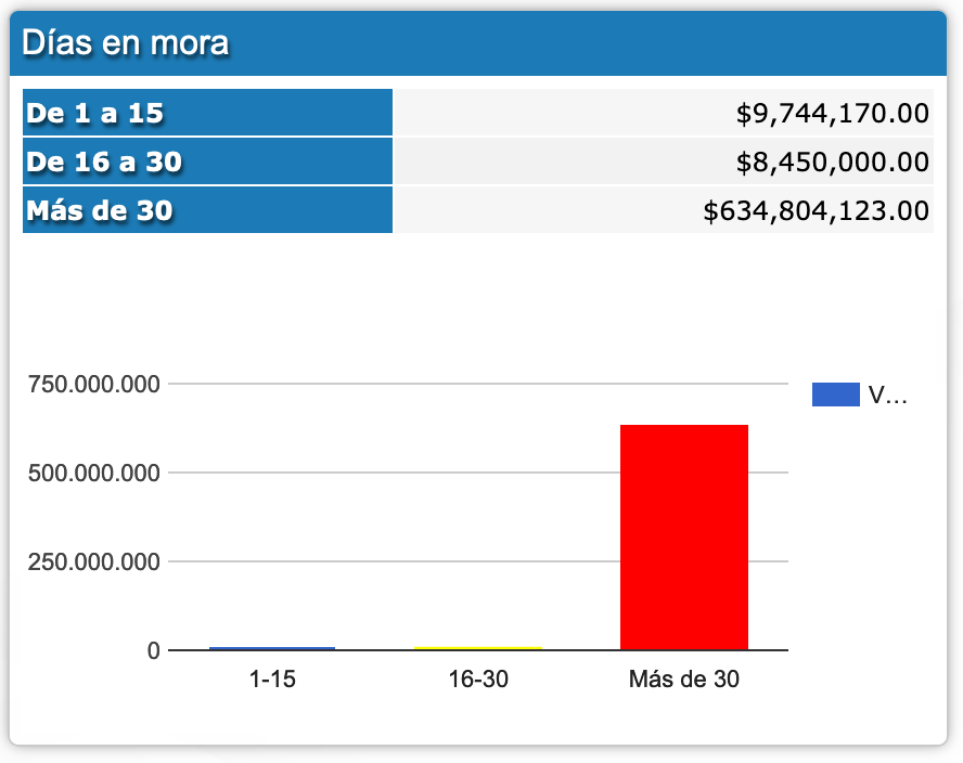 Días en mora: muestra la cartera agrupada por días de mora en 3 rangos: 1 a 15 días, 16 a 30 días y más de 30 días.