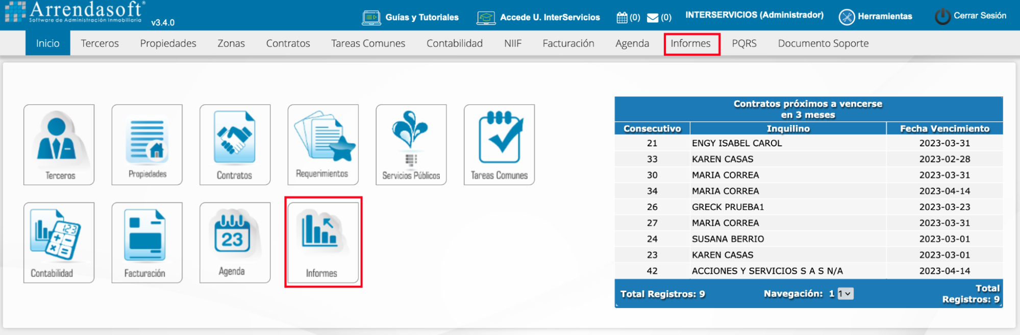 Acceder a la sección: Para acceder a esta sección debemos ir a informes dentro del menú principal o al ícono de informes del dashboard.