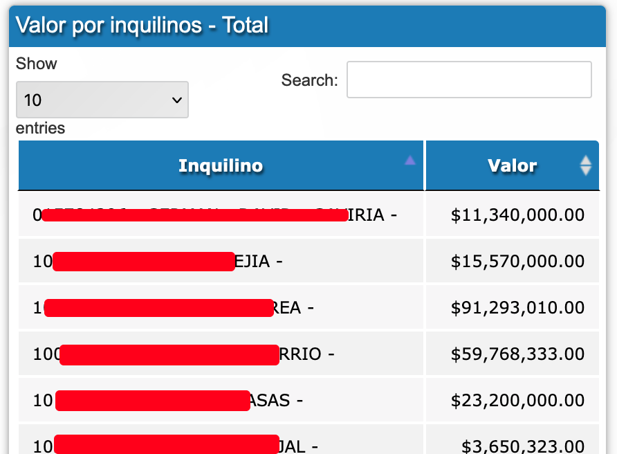 Valor por inquilinos total: muestra la cartera total agrupada por inquilinos.