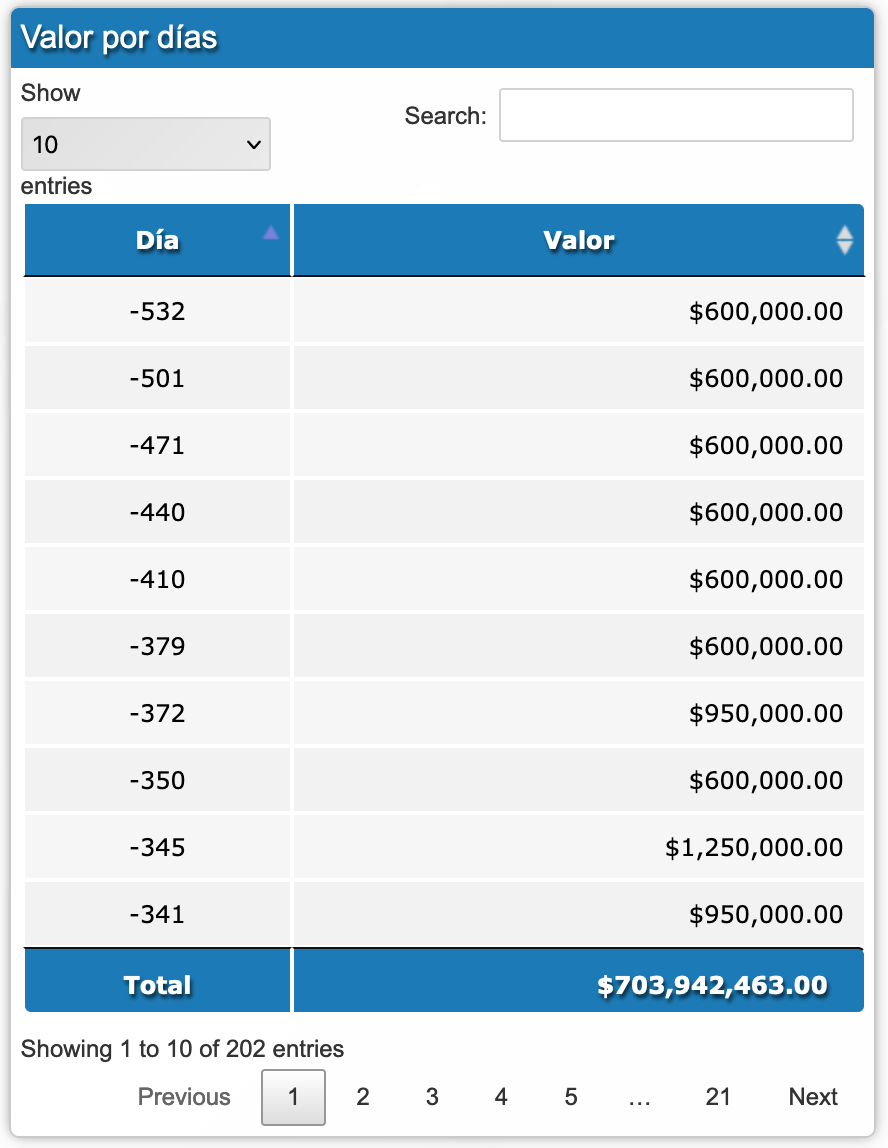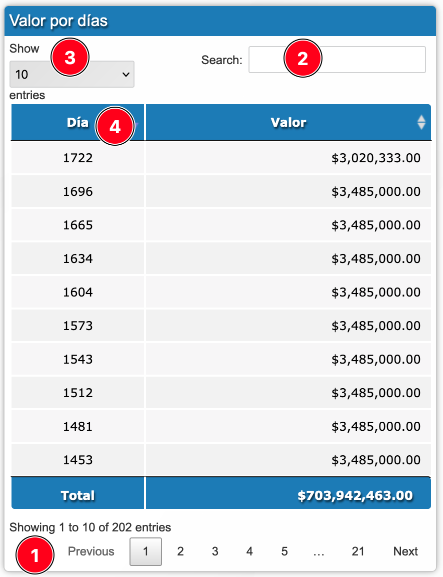Nota importante: en las tablas de datos tenemos la información paginada, un buscador, indicador de cuántos registros por página desea ver y ordenación por columnas respectivamente.