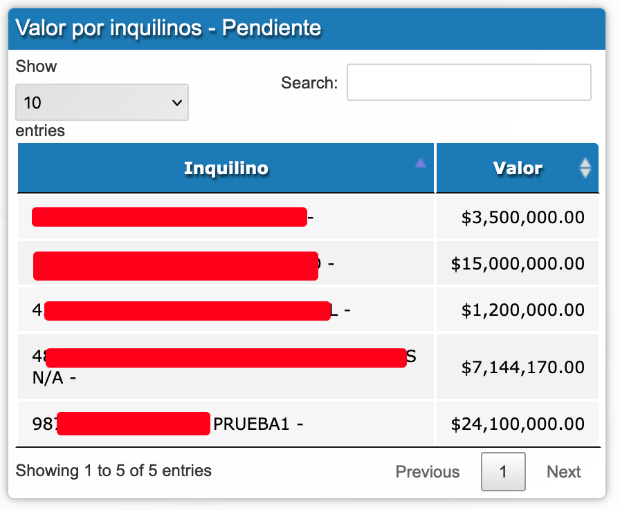 Valor por inquilinos - pendiente: muestra la cartera pendiente agrupando por inquilinos.