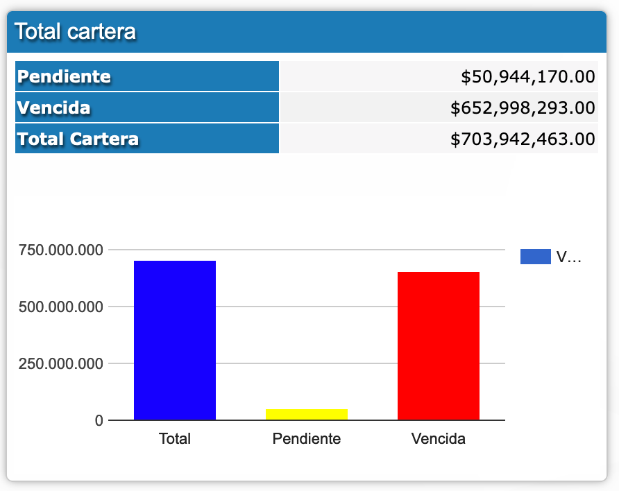Total cartera: muestra el total de la cartera agrupada por pendiente y vencida incluyendo gráfico de barras.