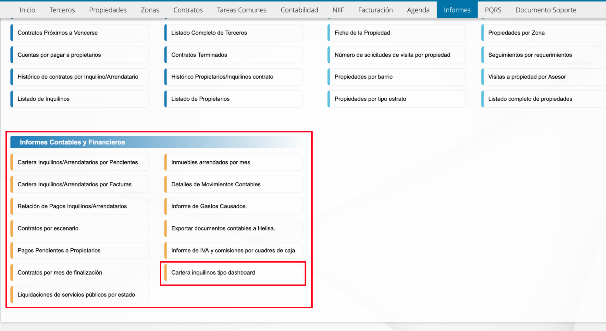 Luego de ingresar al módulo de informes, hacemos clic en el enlace “Cartera inquilinos tipo dashboard” que aparece en el bloque “Informes contables y financieros”.